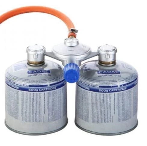Het Cadac Power Pak 1000 geeft je de optie om in plaats van een grote gasfles twee gasblikjes te gebruiken. De blikjes hebben hun eigen drukregelaar met kraan en kunnen via een ‘normale’ gasslang aangesloten worden. Dit kan grote voordelen geven in het pakvolume en gewicht.
