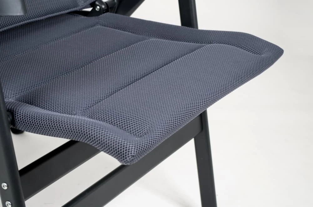 De gepolsterde 3D stof heeft een comfortabele vulling en door de open celstructuur is deze extra luchtdoorlatend. Groot voordeel hiervan is dat de stof van deze Crespo stoel geen vocht vasthoudt. Deze stof loopt helemaal om het frame heen waardoor de campingstoel een heel aangename en comfortabele zit heeft.