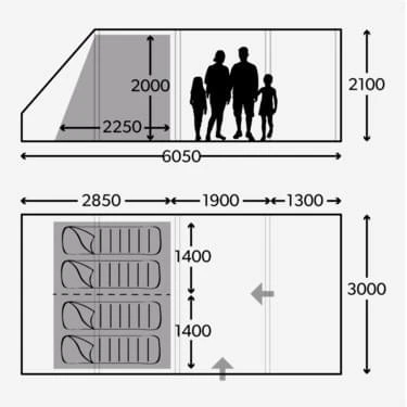 Een gezin van 4 personen brengt natuurlijk veel bagage met zich mee. Gelukkig is er binnen deze 4-persoons tent genoeg ruimte om al je spullen op te bergen en droog te houden. Met een leefruimte van 1,9 meter bij 3 meter en een stahoogte van 2,1 meter heb je genoeg ruimte om veel benodigdheden kwijt te kunnen en kan je ook nog comfortabel rondlopen. Door de schuine afloop aan de achterkant van de tent ontstaat er ook nog een ruimte achter de slaapcabines waarin je je persoonlijke bagage op kan bergen. Deze ruimte bestrijkt de volledige breedte van de tent en is 80 cm diep.
