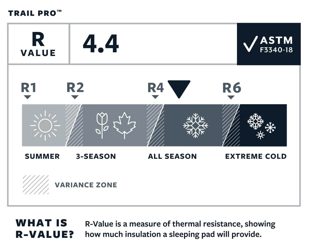 Over de hele slaapmat zijn er duidelijke breedte banen met lucht. Deze geven meer ondersteuning dan losse luchtkamers. Meer schuim betekend dan wel iets zwaarder maar ook een hogere R-waarde waardoor je de Trail Pro R eigenlijk het gehele jaar rond kan gebruiken, binnen of buiten.