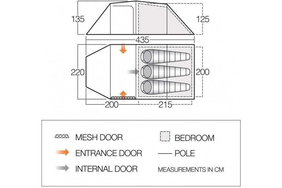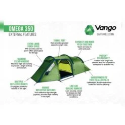 Doordat de binnen- en buitentent aan elkaar zitten is het heel eenvoudig om deze tent op te zetten en weer af te breken. De Omega 350 is een 3 persoons tunneltent met heerlijk veel ruimte. Niet alleen in het slaapgedeelte, maar ook het leefgedeelte is groot en biedt voldoende ruimte voor zowel je spulletjes als een plek om te schuilen voor een zomers bui. De handige o-vormige binnendeur is eenvoudig te openen met één hand en heeft een gedeelte mesh voor extra ventilatie zonder dat er vervelende beestjes naar binnen vliegen. De binnentent is gemaakt van Ademend Polyester en is voorzien van handige opbergvakken.