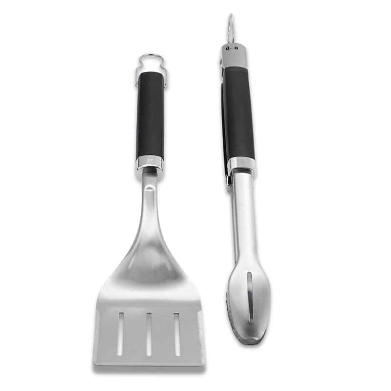 De Precision barbecuetang- en spatelset van Weber is gemaakt om het barbecueën makkelijk en leuker te maken. Zowel de barbecuetang als de spatel zijn gemaakt van duurzaam roestvrijstaal en hebben een zachte handgreep voor goed comfort en controle. Er zit een metalen oog aan om ze aan op te hangen en de tang heeft een makkelijke vergrendeling.